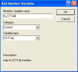 At this point, the application already has the controls in it, but you cannot access them using code because they are not mapped onto any class variables. To do this, hold the control key while you double-click on the C1Tab control. VC++ will tell you it needs to create a wrapper class for the control. Click OK to create the wrapper class, click OK again to accept the default options. In the Add Member Variable dialog box, enter m_C1Tab as the variable name, and click OK to finish.