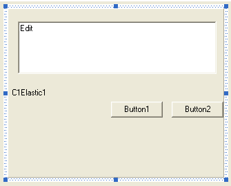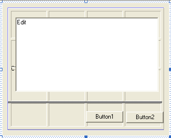 Next, right-click the Elastic, select the Properties menu, select the Main property page and set the Align property to 5 - asFill and the AutoSizeChildren property to 8 – azGrid. Click the Grid Editor button to edit the grid. Right click the bottom horizontal line and select the Splitter menu (as you would in VB). Close the property window and the Elastic will display the grid. Drag the controls so they are close to their positions on the grid, as shown below: (In VB, the controls would snap to the grid at design time. In VC++, they will snap to the grid only at run time.)