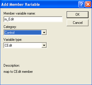 Now hold down the control key and double click the Edit control. The AppWizard will prompt you for the information it needs to create a new member variable. Type m_Edit for the variable name, and select Category Control (instead of Value):