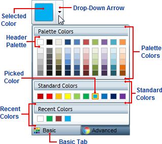 •Basic Tab: Click the Basic tab to access pre-selected colors at run time. Click the Advanced tab to choose a custom color. The Mode property must be set to Basic or Both for the Basic tab to be visible.