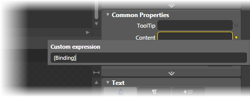 4. Next to the Content property, click the Advanced options button and select Custom Expression. Set the Custom expression field to "{Binding}". This sets up the Content property to pass the DataContext directly to its template, which you will create in a later step.