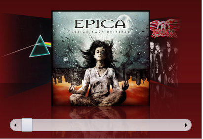 You can completely change the appearance of the C1CoverFlow control by setting a few properties, such as the Background property, which sets the background color of the CoverFlow’s header. For example, if you set the Background property to "#FF490C0D", the C1CoverFlow control would appear similar to the following: