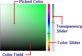 •Transparency Slider: This slider lets you lets you set the color's transparency. You can choose to make the color opaque or partially or completely transparent. Move the Transparency Slider to pick a transparency. This slider is only visible when the ShowAlphaChannel property is set to True (default)