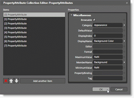 7. In the Property Attribute Collection Editor dialog box, click the Add another item button. Repeat this step seven more times to create a total of eight PropertyAttribute items, numbered 0 to 7.