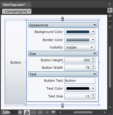 Notice that all the button's properties are now displayed in the C1PropertyGrid control: