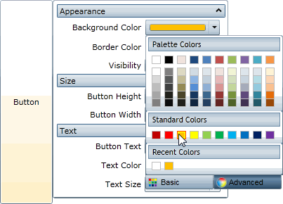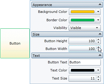 In the previous steps you created a Silverlight application in Microsoft Expression Blend using PropertyGrid for Silverlight, set it to view properties of a Button control, and customized the displayed properties. In this step you'll run your application and view some of the run time interactions possible with PropertyGrid for Silverlight.