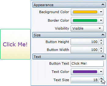 Congratulations! You've completed the ComponentOne PropertyGrid for Silverlight quick start. In this quick start you added the C1PropertyGrid and Button controls to a page, linked the C1PropertyGrid control to the Button, customized the controls, and view the run-time interactions possible with PropertyGrid for Silverlight.