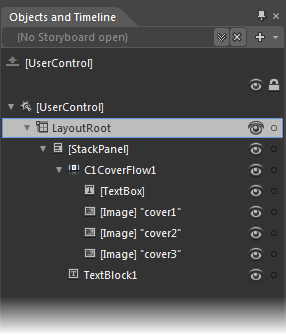 In the last step, you customized the StackPanel, C1CoverFlow, and TextBlock controls by setting a few properties. In this step, you’ll add four items – a TextBox control and three images – to the C1CoverFlow control. You will also customize each item by settings its properties.
