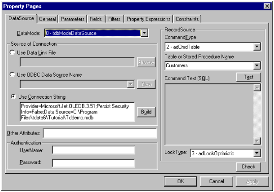 The DataSource page design is modeled after the property pages of the standard ADO data control (Microsoft ADODC). This ensures smooth upgrade path for users familiar with ADODC. The difference is that three separate ADODC property pages: General, Authentication, and RecordSource, are combined in one True DataControl DataSource page for more convenience.
