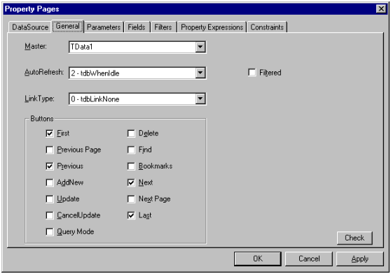 The General page is used to set the overall characteristics of a TData control, that is, those properties belonging to the TData control itself. The remaining pages manage the control’s collections.