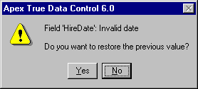 When the message box closes, True DataControl returns focus to the bound control where the error occurred. If the user answered Yes to the prompt, True DataControl restores the previous value in the control so the user can move focus out of the control without leaving incorrect value there.