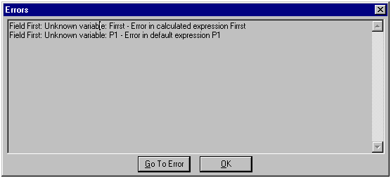 To view an error, navigate through the error list and select an error to view, then press the Go To Error button. The property page where the error originated opens and the focus is set to the particular tree node and control containing the incorrect information. But the Go To Error button is enabled only if you press the Check button in property pages. It is disabled if you select the Check item from the control’s context menu. In this case, the error list window is displayed only to notify you of errors. If you need to use Go To Error button to view one of these errors, press the Check button in property pages.
