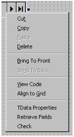 Right-click anywhere on the TData control at design time to display the context menu, which is a superset of the context menu that Visual Basic provides for all ActiveX controls.