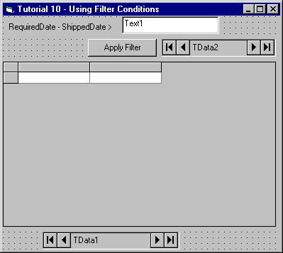 TData1.ConnectionString Provider=Microsoft.Jet.OLEDB.3.51;Persist Security Info=False;Data Source=C:\Program Files\ComponentOne Studio\Common\TDDEMO.MDB TData1.CommandType 2 – adCmdTable TData1.RecordSource Orders DataGrid1.DataSource TData1 Text1.DataSource TData2 Text1.DataField Interval Label1.Caption RequiredDate – ShippedDate > Command1.Caption Apply Filter |