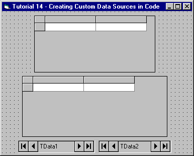 Place the following controls on the form (Form1) as shown in the figure: two TData controls (TData, TData2) and two DataGrid controls (DataGrid1, DataGrid2).