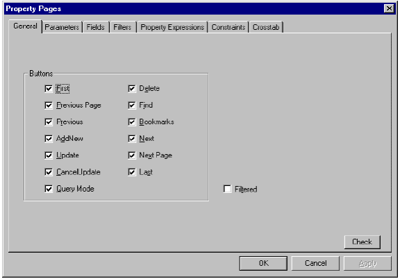 In the General property page check all the check boxes in the Buttons group. Close the property pages by clicking the OK button or by pressing Enter. This will save the changes you have just made for TDataLite1. You will see thirteen buttons appear on the TDataLite1 control.