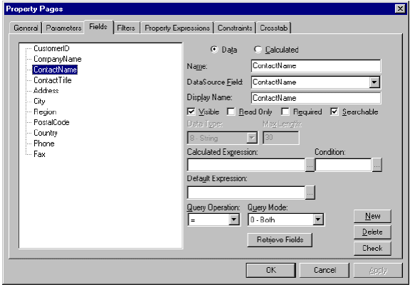 Open TDataLite1 property pages by select the TDataLite Properties option in TdataLite1 context menu. Select the Fields property page. You will see all fields of the Customers table. In this example, we need to expose three fields: CustomerID, CompanyName, and City. To do this, one at a time select each of the other fields in the data source tree-view window, and clear the Visible check box for all of them. An empty check box means that the field is accessible to your TDataLite control, but is not exposed to controls that are bound to it.