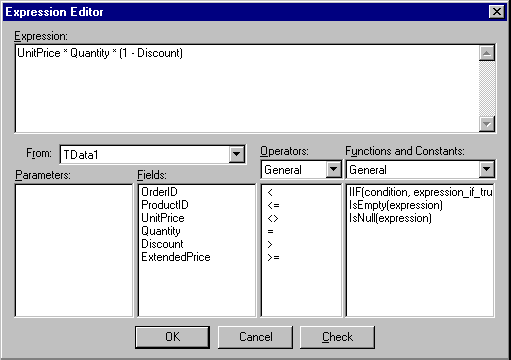 You can build or edit an expression with the help of four lists of elements available in the expression: Fields, Parameters (which will be introduced in Tutorial 7), Operators, and Functions and Constants. In case there is a master TData control defined (see subsequent tutorials for an explanation of master-detail relationships), you can choose to display variables (parameters and fields) of either the TData control itself or one of its ancestors, by selecting it in the From combo box. You can also select a category of operators and functions in the two combo boxes above the lists: Operators, and Functions and Constants. Double-click on one of the elements in any of the four list boxes to paste the selected element into the expression.