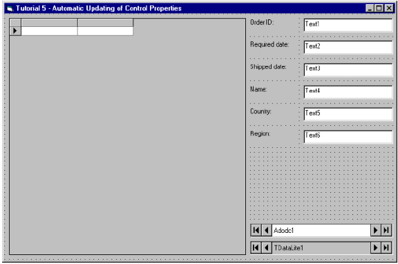 Note: You can set the DataSource property of the six TextBox controls either to Adodc1 or to TDataLite1, it does not matter in this case. Also, we deliberately used only controls other than TDBGrid in this tutorial, to demonstrate that this feature works for any data bound control. |