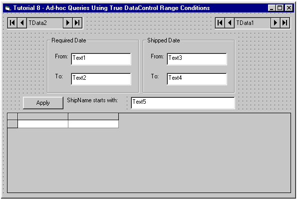 Set the DataMode property of TData2 to 1 - MemoryArray and define five fields: RequiredDate1, RequiredDate2, ShippedDate1, ShippedDate2 (all four with Data Type set to 7 - Date) and ShipName (8 - String). Follow these steps: