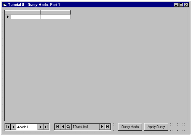 In this tutorial, we will create a form that can function in two modes: query and results. The same TDataLite control and the same DataGrid are used to represent data in either mode.