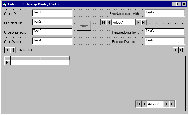 Pressing the Apply button applies the specified query to Adodc2. TDataLite1 remains in query mode at all times.