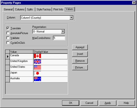 Since the FormatText event now translates the country codes stored in the database into actual names for display, the Value property of each member of the ValueItems collection must be changed accordingly. The following figure depicts the updated Values property page (only the entries in the Value column are different).