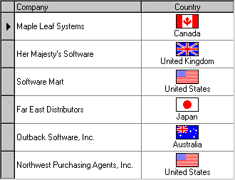 The horizontal placement of the bitmap with respect to the cell text is determined by the Alignment and ForegroundPicturePosition properties of the column's Style object. In the following example, Alignment is set to 3 - General. Since the Country column represents a string field, the cell text is left-aligned. However, since the ForegroundPicturePosition property is set to the default value of 0 - Left, the bitmap is placed at the left edge of the cell, and the cell text is left-aligned in the remaining space.