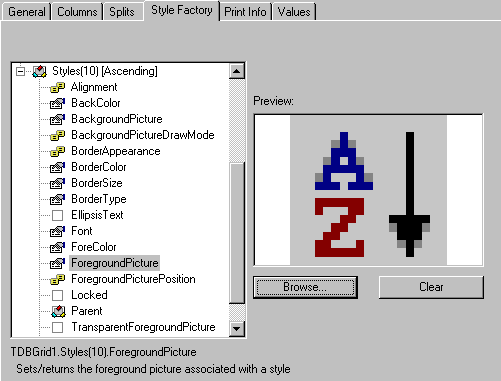 Dim S As TrueDBGrid80.Style Set S = TDBGrid1.Styles.Add("Ascending") S.Parent = "Heading" S.ForegroundPicture = LoadPicture("atoz.bmp") S.ForegroundPicturePosition = dbgFPRightOfText S.TransparentForegroundPicture = True |