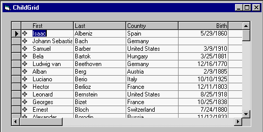 Run the program and notice that TDBGrid2 is rendered invisible and there is an expand icon ("+") beside the left most cell in each row. As you can see, our master table, contains a list of composers including vital statistics. Note, that as you scroll right, the expand icon remains in the left most cell at all times.