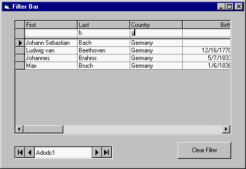 Note the use of the FilterChange event to manipulate the underlying recordset. When you run the program you will see a form similar to this one.