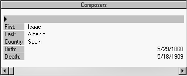 In situations where you would like to display data one record at a time, you can set the DataView property to 3 - Form. You can set this property at either design time or run time to display data in an editable form similar to the one in the following illustration.
