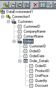 The following example illustrates the hierarchical relationships in a master-detail data source named DataEnvironment1. There are three recordsets, or Bands in this example. Customers is the master band (Band 0), whose fields will be displayed in the grid first. Relationships between Customers and Orders (Band 1), and between Orders and Order_Details (Band 2) enable you to create a nested display of detailed data for your users to expand and collapse as needed. Each Customers record is joined to the Orders records by a relation defined on the CustomerID fields. Orders are joined to the Order_Detail data by a relation defined on the OrderID fields.