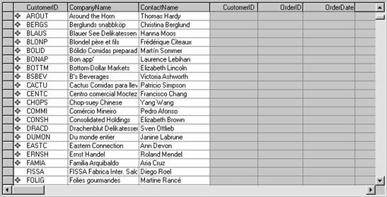 At run time, the grid displays read-only data. The next figure illustrates the initial display of DataEnvironment1. The data from the master recordset (Customers) is displayed first, and the fields from the detail recordset bands appear to the right. The detail recordset fields initially contain no data, however. An expand icon ("+") at the left edge of a record indicates the presence of hierarchical data. Note that in this example, only one record, CustomerID FISSA, has no detail records.