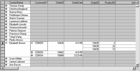 In this example, if a user clicks the collapse icon in the CustomerID field (CONSH), the records held in the Order_Details fields collapse (OrderID, ProductID, and so on), and are no longer visible. Also, the collapse icon changes back to an expand icon. However, if the user clicks the collapse icon in the ContactName field (Elizabeth Brown) first, the fields in the Order as well as the Order_Details band collapse, and the grid will look the same as it did when it was first displayed.