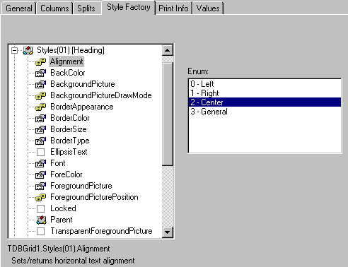You can change the appearance of the overall grid at design time by modifying a named style using the Style Factory property page. For example, to force all column headers to center their caption text, you can change the Alignment property of the built-in Heading style to 2 - Center.
