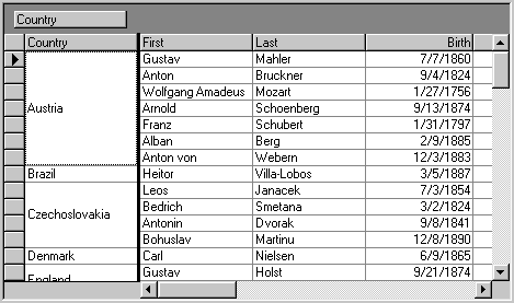 When a column is added to the grouping area, either in code or by user interaction, its Merge property is implicitly set to True. Therefore, if adjacent fields are identical in a grouped column, those fields are rendered as a single non-editable cell, as shown in the following illustration.