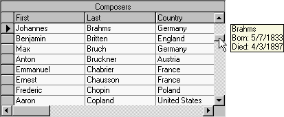 If the ScrollTips property is set to True, moving the scrollbar thumb causes the FetchScrollTips event to fire. You can use this event to track the position of the scroll bar on a record by record basis. You can also use this event to present the user with useful information relating to the current record or recordset. When used in tandem, the ScrollTrack and ScrollTips properties provide users with visual feedback when scrolling through large recordsets.