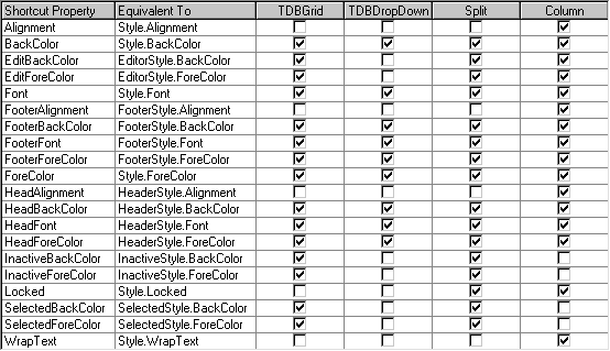 The following grid shows the style property equivalent for each shortcut. It also indicates which properties are supported by the TDBGrid and TDBDropDown controls, and which properties are supported by the Split and Column objects.