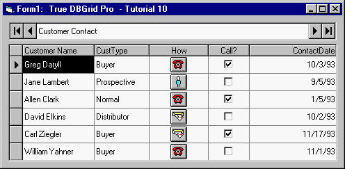 The possible values of the ContactType field are 0, 1, and 2, which represent telephone, mail, and personal contact, respectively. We shall display bitmaps in the cell instead of these numeric values. If you installed the full product, you will find the following files in the BITMAPS subdirectory of the True DBGrid installation directory: PHONE.BMP, MAIL.BMP, and PERSON.BMP.