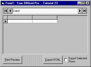 Set the Caption property of Command1, Command2, and Check1 to "Print Preview", "Export HTML", and "Export Selected Rows", respectively. Your form should now look like this: