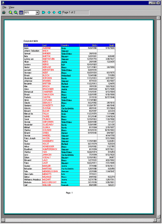 Click the Print Preview button to display a separate application window similar to the following. Note that the output mirrors the format of the grid.