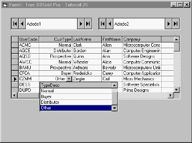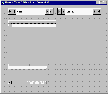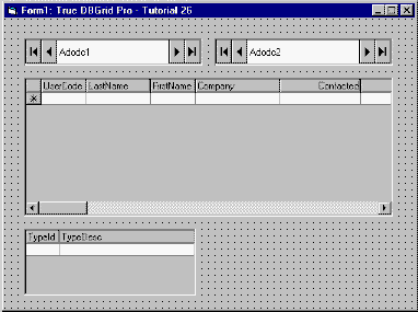 Place two ADO Data controls, a True DBGrid control and a True DBGrid Dropdown control on the form. The form should look similar to this: