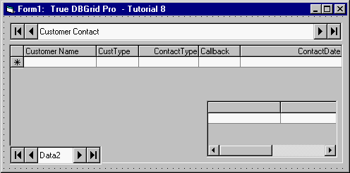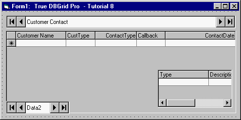 Set the DatabaseName property of Data2 to TDBGDemo.MDB, the RecordSource property to CustType, and the Visible property to False.