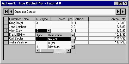 Click a cell in the CustType column to make it the current cell as indicated by the highlight. A button will be displayed at the right edge of the cell. Click the button to display the True DBDropDown control as shown in the following figure.