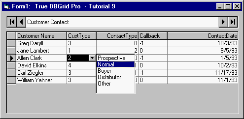 Click a cell in the CustType column to make it the current cell as indicated by the highlight. A button will be displayed at the right edge of the cell. Click the button to fire the ButtonClick event. List1 will drop down at the right edge of the cell as shown in the following illustration.