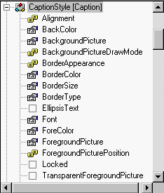 With the exception of the Values page, all property pages use property trees to depict the object model of the grid or one of its collections. Property trees are similar to the list of folders displayed in the left pane of Windows Explorer. Just as folders preceded by a plus sign contain other folders, property tree nodes preceded by a plus sign represent sub-objects with their own set of editable properties. To expand a sub-object node and view its properties, click the adjacent plus sign or double-click the node's name or icon. The following illustration shows the General property tree for a grid with its CaptionStyle property expanded.
