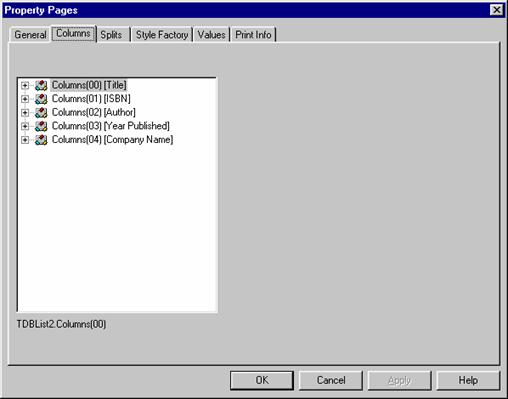 The splits of a TDBList or TDBCombo control provide users with different views of the same data source. Therefore, corresponding columns in different splits must be bound to the same data fields. A few other column properties are global to all splits as well. The Columns property page provides a shortcut to the Columns collection of the General property page. It is used to set global Column object properties that cannot vary from one split to another.