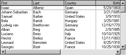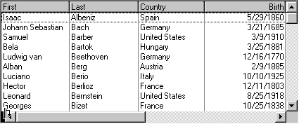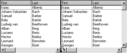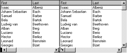 A typical list with AllowSizing set to False is shown in the following figure. Notice that there is no split box at the left edge of the horizontal scroll bar.