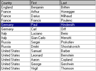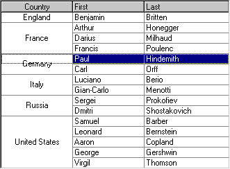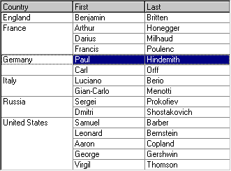 If the underlying list data is sorted, you may be able to improve the readability of the display by grouping adjacent like-valued cells within the sorted column(s). The Merge property of the Column object controls whether its data cells are grouped in this manner to form a single noneditable cell. By default, this property is False, and each physical row within a column displays a data value, if any.